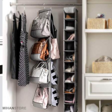 آویز کیف طبقاتی داخل کمد محصولی نوین و بسیار کاربردی است. این آویز به صورت دوطرفه همراه با قلاب آویز جهت آویزان کردن داخل کمد و یا پشت درب می باشد. آویز کیف طبقاتی امکان استفاده از حداقل فضای ممکن برای نگهداری کیف های شما را فراهم می کند. فضای محفظه های نگهدارنده به گونه ای طراحی شده که علاوه بر کیف از آن می توان جهت نگهداری کفش نیز استفاده نمود. از دیگر ویژگی های این آویز، جلوگیری از کثیف شدن، له شدن و خراب شدن کیف و کفش است. محصولی با طراحی جدید، ساده و در عین حال بسیار کاربردی که می تواند مشکل شما در نگهداری از کیف های دستی را برطرف کند. آویز و نگهدارنده کیف به صورت دوطرفه طراحی شده و ظرفیت آن 8 کیف می باشد.