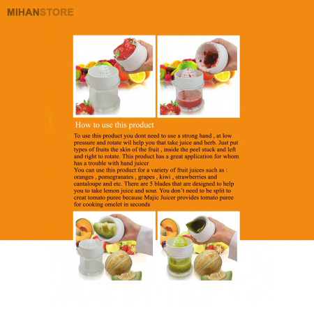 آبمیوه گیری جادویی Majic Juicer یک وسیله پرکاربرد در فصل زمستان است. خوردن آب پرتقال و لیمو در فصل سرما باعث ایمن شدن بدن در برابر سرماخوردی می شود. اما گرفتن آب مرکبات دردسرهای خود را دارد ولی با آبمیوه گیری جادویی به راحتی هرچه بیشتر می توانید با چند حرکت ساده آب پرتقال، لیمو، کیو و ... را بگیرید. طرز استفاده از آبمیوه گیری جادویی Majic Juicer بسیار ساده است و هرکس در هر سنی می تواند از آن استفاده کند، چرا که برای این کار نیاز پنچه های قوی و بازوهای پرتوان نیست. فقط کافیست پرتقال ، لیمو یا هر میوه دیگر را از طرف پوست داخل پوست گیر قرار دهید و آن را روی پره های آبگیر بفشارید و با چرخش به سمت چپ و راست تا آخرین قطره آب میوه را خارج نمایید. گرفتن آب مرکبات بدون دخالت مستقیم دست از مهمترین عملکرد Majic Juicerمی باشد. درپوش پوست گیر میوه برش خورده را آن چنان به پره های آب گیر می فشارد که تمامی آب میوه خارج می شود.