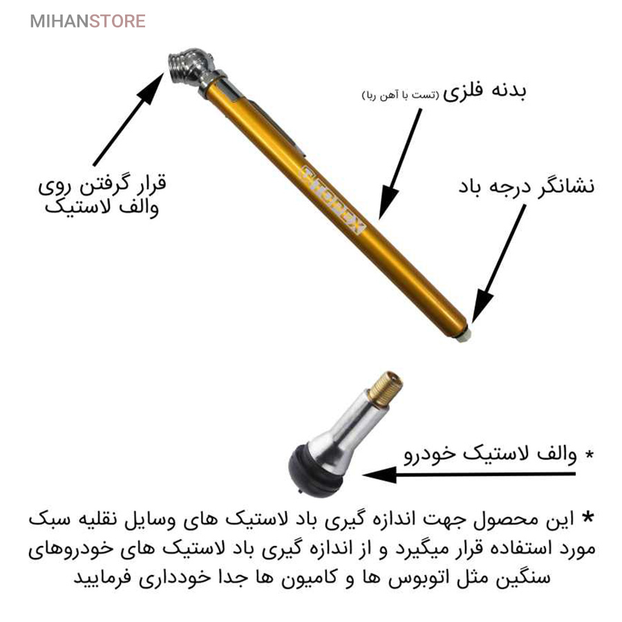 درجه تنظیم باد لاستیک خودرو تاپیکس با طراحی نوین تولیدشده از بدنه فلزی به طول 14 سانتیمتر و قطر 1 سانتیمتر همانند یک خودکار در جیب یا داشبورد خودرو جا شده فضای اندکی را اشغال و بهراحتی در دسترس خواهد بود. این درجه تنظیم باد خودرو مدرج به 4 واحد اندازهگیری و قابلیت حداکثر 50 جهت اندازهگیری باد لاستیکهای وسایل نقلیه سبک مورداستفاده قرار میگیرد و از اندازهگیری باد لاستیکهای خودروهای سنگین مثل اتوبوسها و کامیونها جدا خودداری فرمایید.