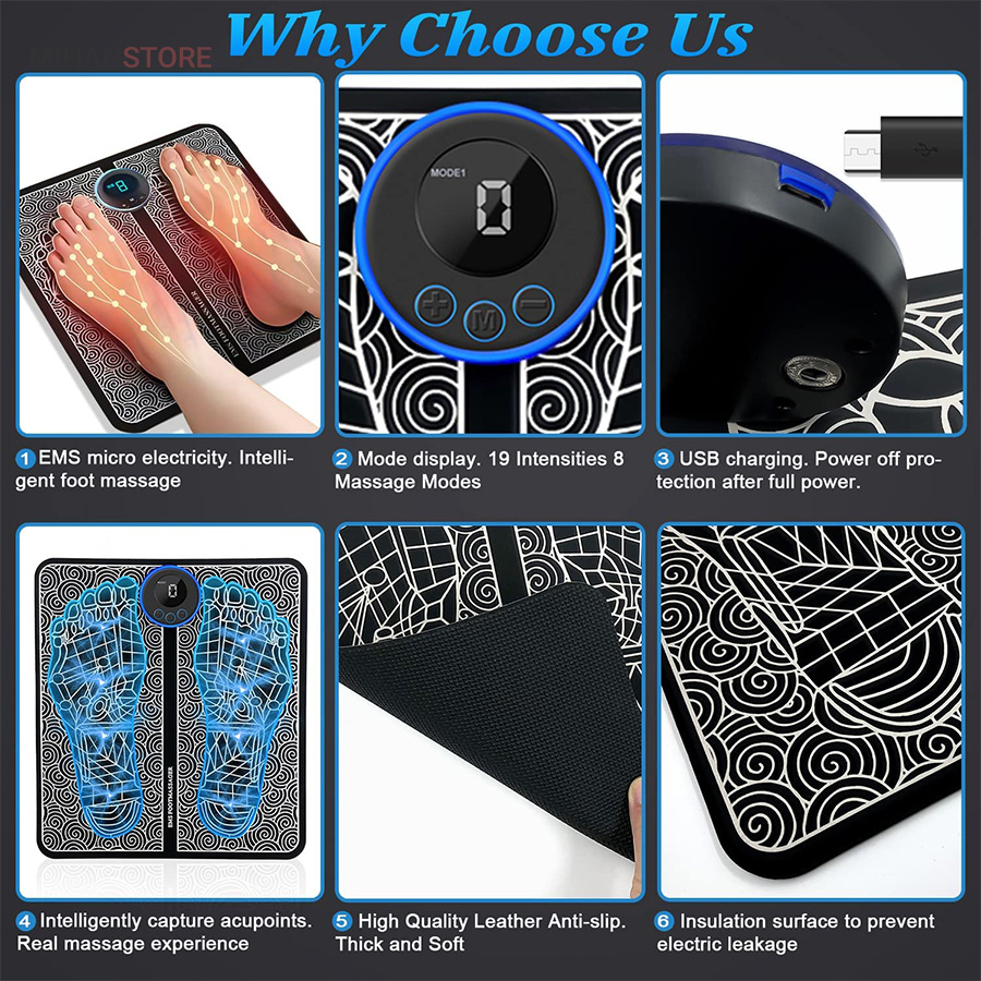ماساژور هوشمند پا EMS Foot Massager یک پد نرم به نرمی پد یوگاست ولی بسیار باریکتر که توسط باتری موجود در کنترل آن امواج مغناطیسی را به کف پای شما میفرستد. کف پا را به تخصصی ترین شکل ممکن ماساژ میدهد. این ماساژور تاشو بسیار سبک و قابل حمل می باشد. باتری آن با کابل USB که بهمراه پد تقدیم شما میشود شارژ میشود. این پد که از جنس پد یوگاست به راحتی با دستمالی نم دار و به راحتی قابل تمیز شدن است. با کمک این پد بی صدا به آرامشی بی نظیر در کف پای خود خواهید رسید. چرا که این پد از کف پا با به گردش در آوردن خون در رگها و به حرکت در آوردن عصب ها پای شما را تا قسمت ران ها ماساژ خواهد داد. ماهیچه های خواب رفته و ضعیف را قوت میبخشد.برای برآوردن نیازهای مختلف ماساژ، تکنیکهای شبیهسازی هوشمند ماساژ مصنوعی با توجه به ترجیحات شخصی و استرس فیزیکی، میتوانند آزادانه از درجات شدت مختلف و حالت های مختلف به دلخواه انتخاب و تنظیم کنید.برعکس برخی ماساژور سنتی پا که وزن سنگینی دارند، این محصول فقط یک پد نرم و راحت برای پا است. سبک و تاشو با امکان حمل آسان در هر مکانی است. این ماساژور پا از مواد نرم مناسب یوگا و سطح چرمی ساخته شده است و با استفاده از حوله مرطوب قابل خشک شدن است. کاملا بی صدا است می توانید هنگام تماشای تلویزیون، مطالعه، کار در دفتر یا استراحت از آن استفاده کنید.با تکنولوژی EMS،گردش خون را در پاها و ساق پا بهبود می بخشد.بر خلاف ماساژورهای معمولی پا، ماساژور پا EMS بسیار ملایم است و برای انواع پوست مناسب است.این دستگاه برای افرادی که به باشگاه می روند، افرادی که مسافت های طولانی را طی می کنند، افرادی که اغلب دوچرخه سواری می کنند، می رقصند، از کوه ها بالا می روند و افرادی که دوست دارند کفش پاشنه بلند بپوشند، مناسب می باشد. همچنین برای مسافران، افراد میانسال و سالخورده، افرادی که دارای شغل اداری هستند مناسب است. ماساژ منظم پا به شما کمک می کند تا با خستگی های روزانه خود مقابله کنید. این دستگاه پاهای شما را در یک روز پر کار آرام کرده و خستگی انباشته را از بین می برد. ماساژور الکتریکی پا با ورود پالس ها به زیر غشاء پوستی خطوط عصبی را تحریک می کنند تا به طور خودکار با هم تعامل کنند و آرامش را به پا های شما بازگرداند.