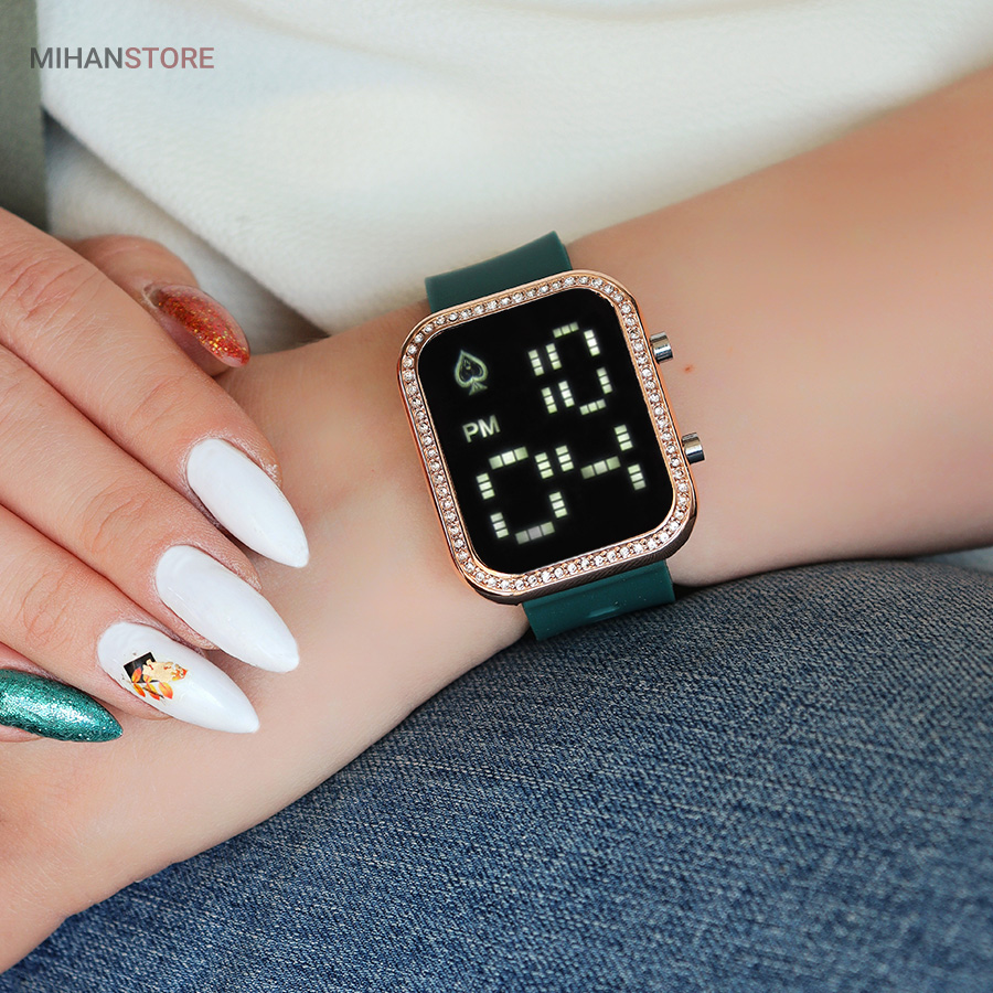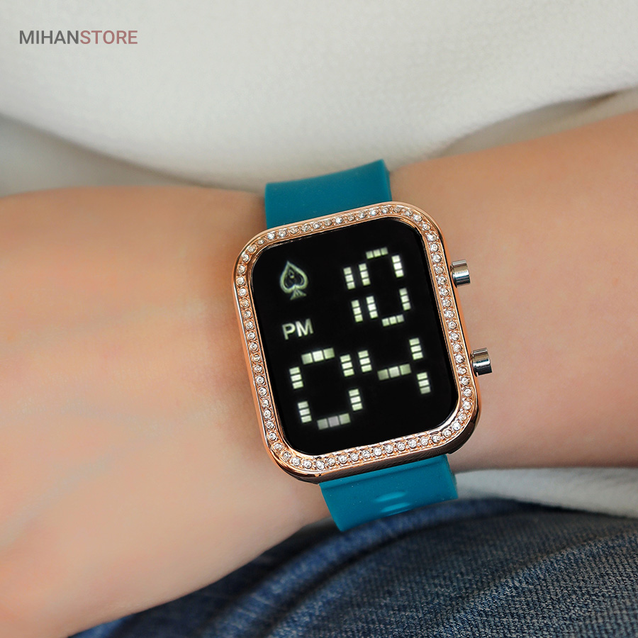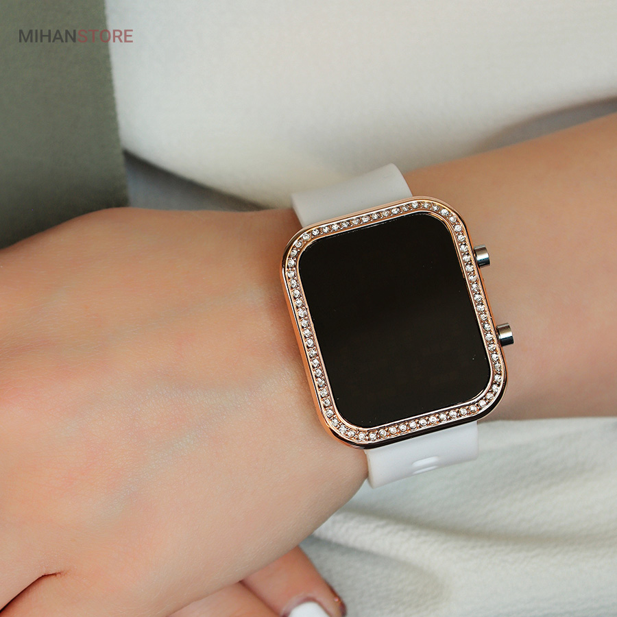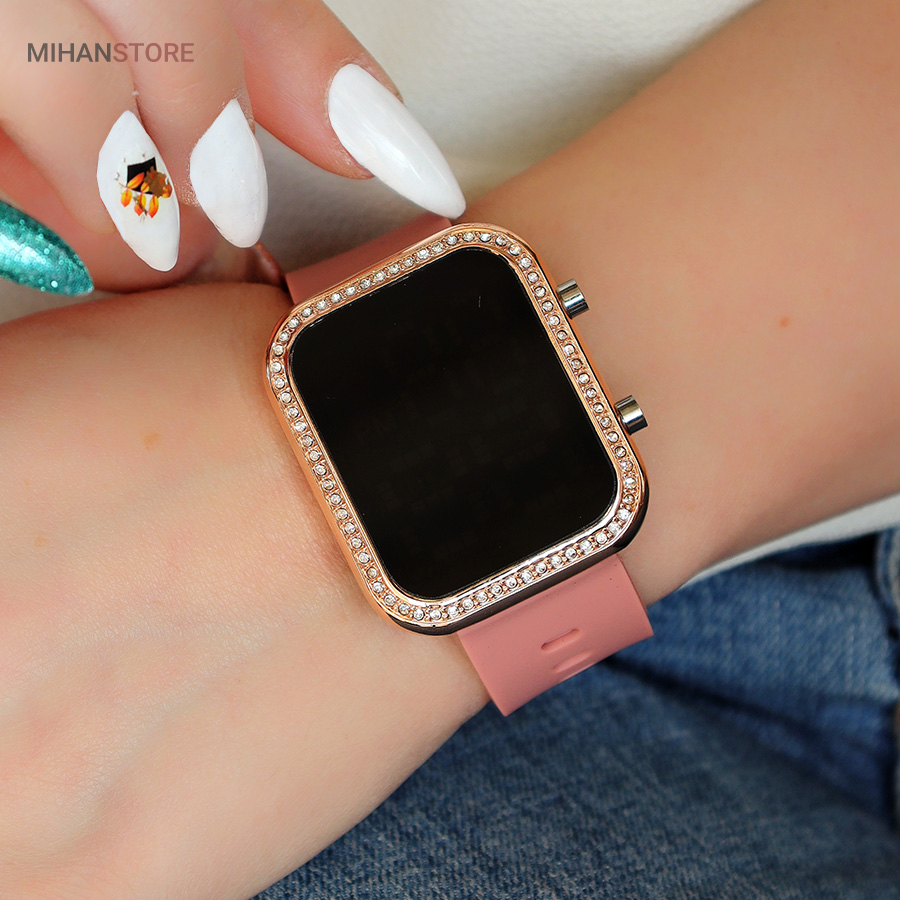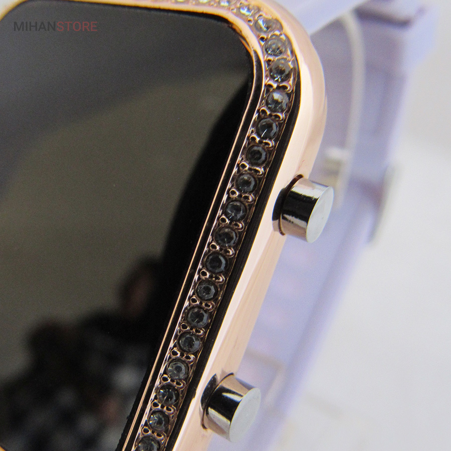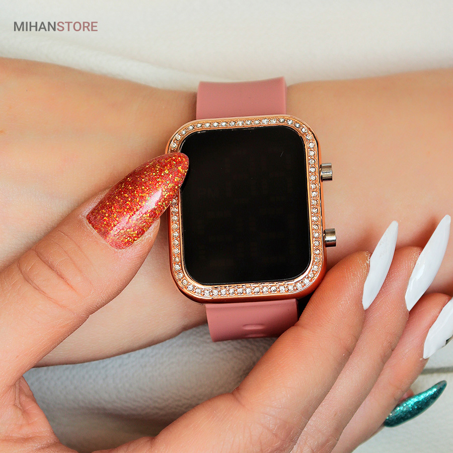 است.نگین های زیبا طراحی شده دور بدنه ساعت جذابیت آن را دو چندان کرده. این ساعت دارای وزن سبک است و سنگینی زیادی روی مچ دست شما ندارد.صفحه بسیار زیبا و شفاف که با لمس دکمه کنار ساعت صفحه نمایش به شکلی زیبا پدیدار میشود، مزیت جالب