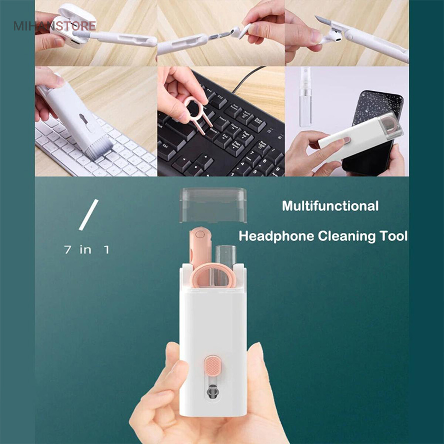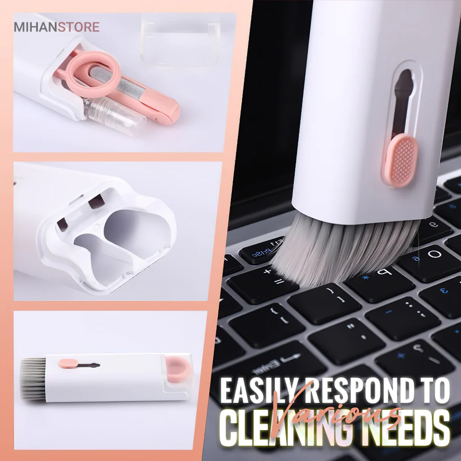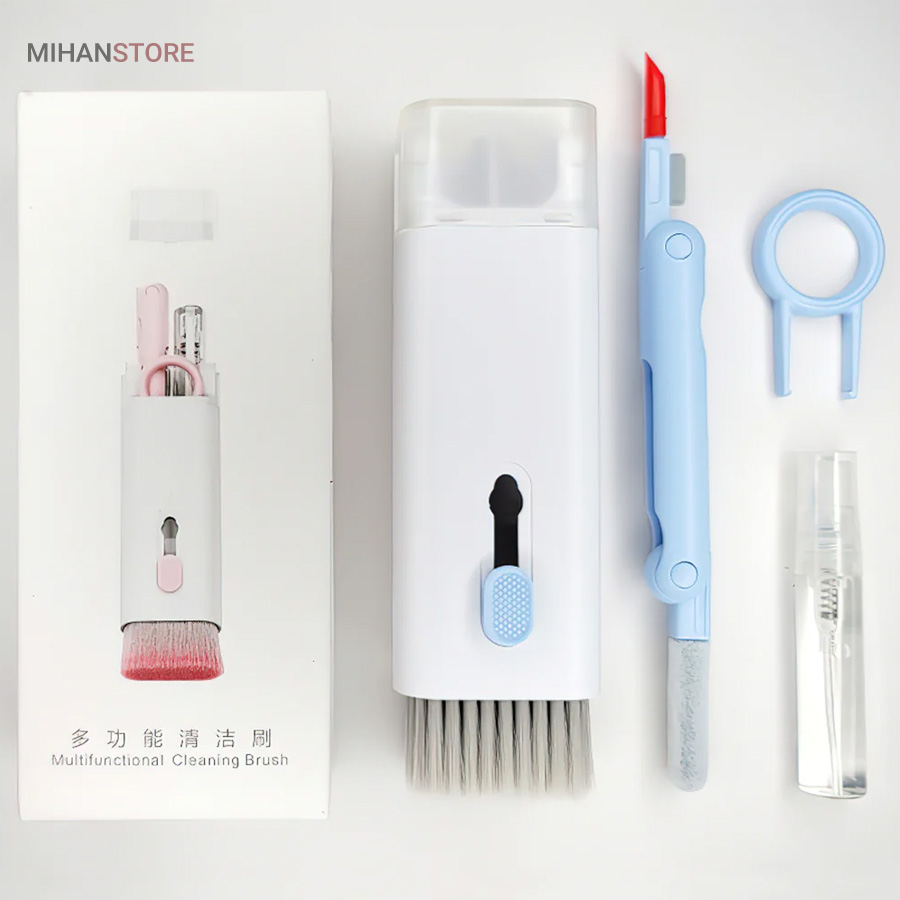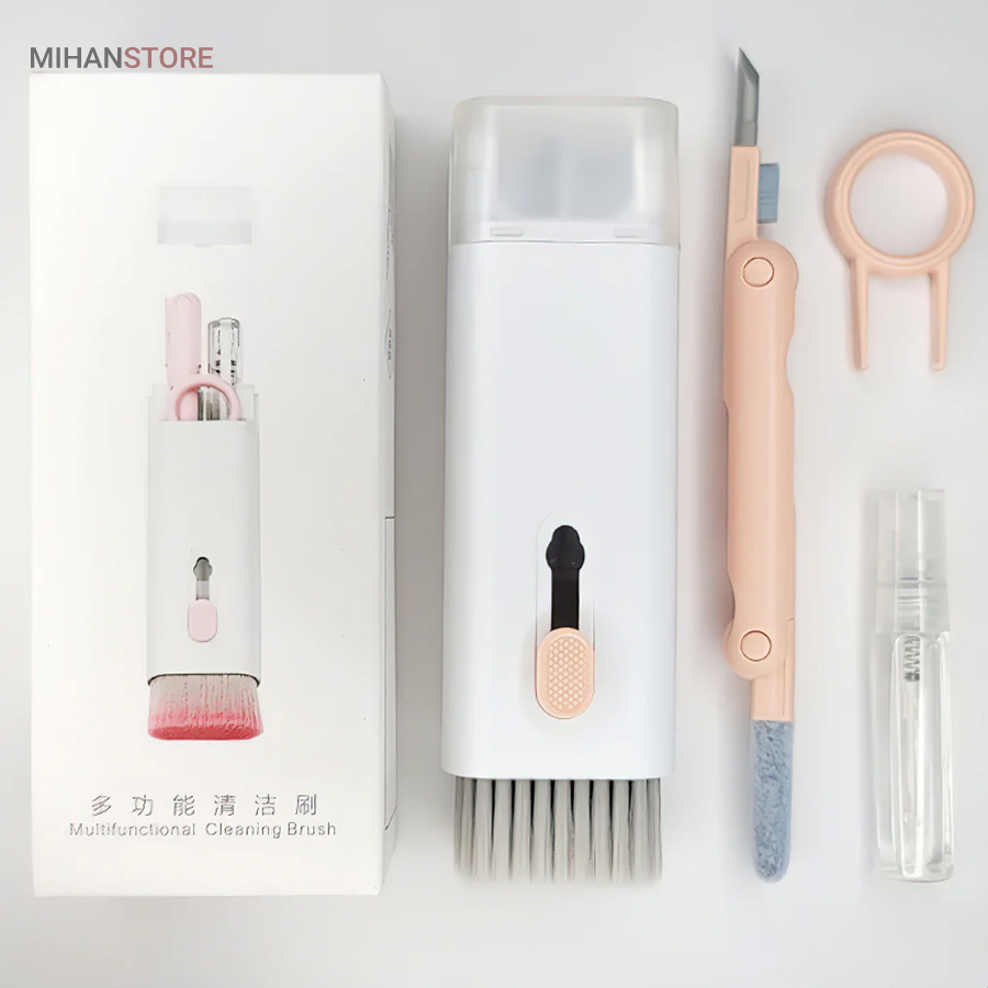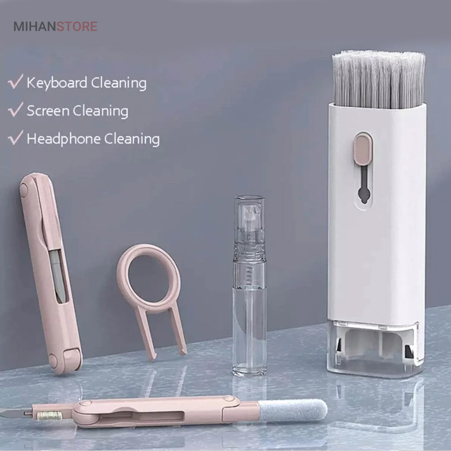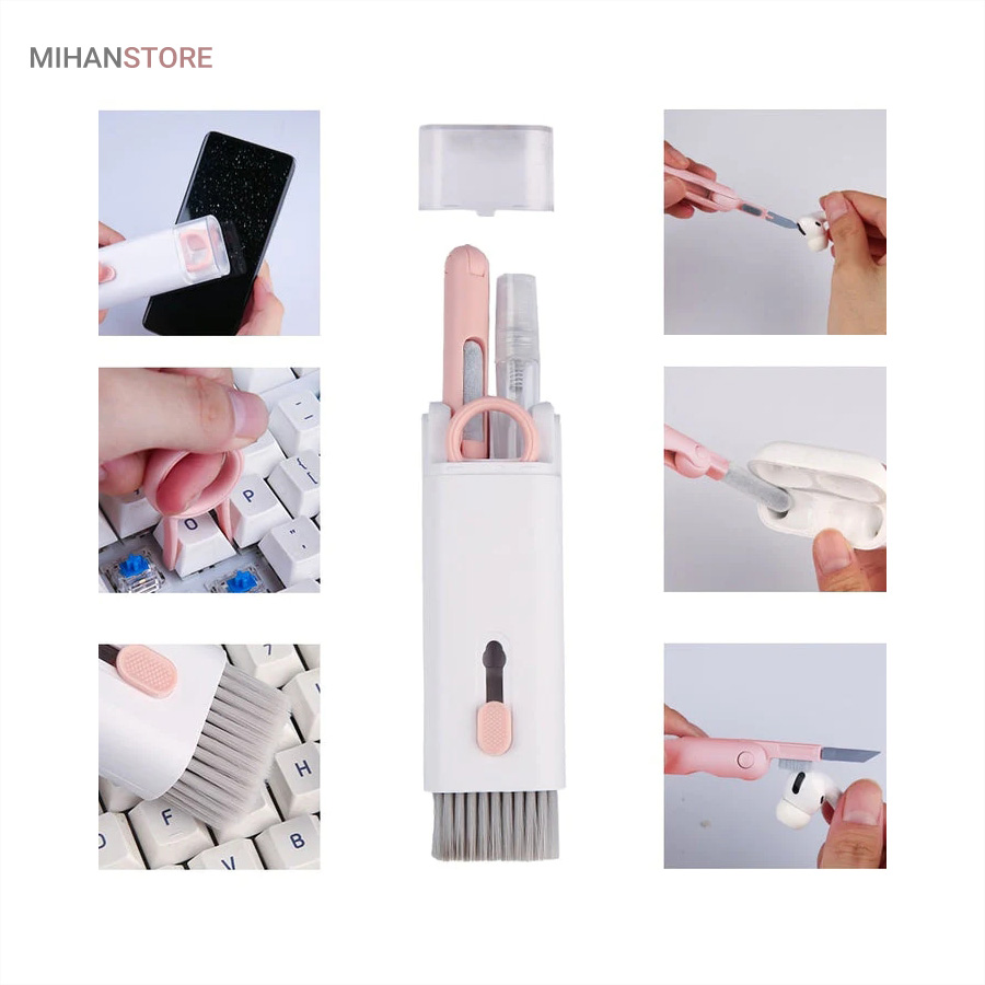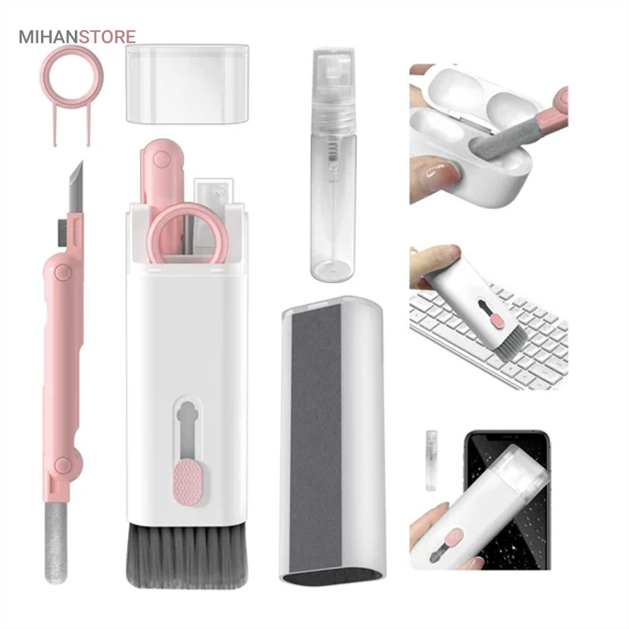 این کیت تمیزکننده 7 کاره شامل 1 برس بزرگ با تراکم بالا، 1 عدد پد تمیز کننده فیبری (مخصوص سطوح مانند مانیتور) ، 1 قلم تمیز کننده گوشی (شامل نوک فلزی، اسفنج و مینی برس با چگالی بالا)، 1 عدد کلیدکش کیبورد و 1 بطری اسپری می باشد. این سرویس پاک کننده چند منظوره می تواند هر خواسته شما را برای تمیز کردن وسایل الکترونیکی برآورده کند. اولین ابزار یک خودکار تمیزکننده تاشو با نوک سیلیکونی، برس کوچک سخت و اسفنج جمعکننده کثیفی ها ، مناسب برای تمیز کردن ایرپاد و سایر هدفونها یا هندزفری ها. نوک سیلیکونی برای تمیز کردن لکه های شکاف است. دومین ابزار برس کوچک برای تمیز کردن گرد و غبار سطوح عمیق و اسفنج دسته دار برای تمیز کردن حفره های کیس شارژ ایرپاد ها میباشد. ابزار سوم تمیز کننده لپ تاپ، رایانه، تبلت و صفحه کلید می باشد کافیست برس نرم بزرگ را بکشید تا گرد و غبار روی رایانه، لپ تاپ، تبلت و صفحه کلید پاک شود. و همچنین می توانید از کلیدکش کیبورد جدا کردن کلیدهای صفحه کلید مکانیکی برای انجام این کار استفاده کنید. ابزار بعدی تمیز کننده مانیتور، صفحه نمایش، دوربین، ساعت و تلویزیون میباشد: در کنار یک بطری خالی اسپری 5 میلیلیتری، مایع تمیزکننده یا آب را درون بطری قرار میدهید و از صفحه فیبری برای تمیز کردن صفحههای مختلف استفاده میکنید. به عنوان مثال صفحات نمایش ، تلویزیون، ساعت، دوربین و غیره.اندازه جمع و جور و سبک وزن: 7 ابزار تمیز کردن کامپیوتر به طور مرتب در یک جعبه مستطیلی قرار گرفته اند. اندازه کیت پاک کننده فقط 4.88 * 1.73 * 1.18 اینچ و وزن آن تقریبا 80 گرم است. برای سفر به اندازه کافی کوچک است و می توانید آن را حمل کنید. در همین حال، شما همچنین می توانید هر ابزار تمیز کننده ای را به طور جداگانه بیرون بیاورید.