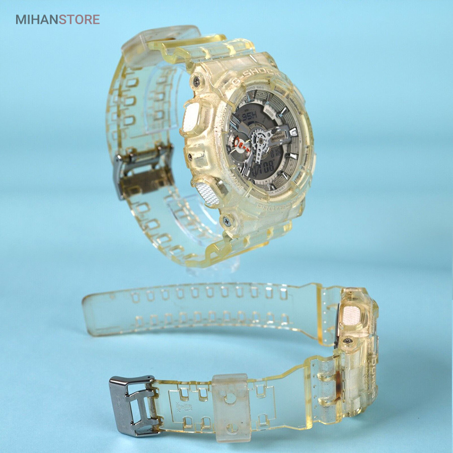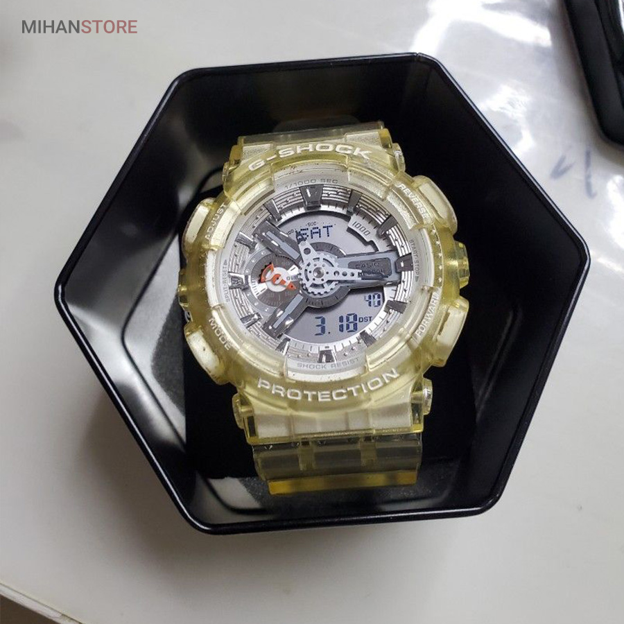 G-SHOCK عناصر دنده ای شکل عمقی سه بعدی ایجاد می کنند و عقربه های آنالوگ به G-SHOCK جلوه قوی و قدرتمند آن را می دهند. G-SHOCK به گونه ای طراحی و ساخته شده است که علاوه بر استحکام مطلق و ضد ضربه بودن، در برابر آب تا 20 بار نیز مقاوم بوده و همچنین دارای خواص ضد مغناطیسی برای زمان دقیق می باشد. GA-110 همچنین دارای بسیاری از عملکردهای مفید مانند زمان جهانی، کرونومتر، تایمر شمارش معکوس و هشدارهای روزانه است.