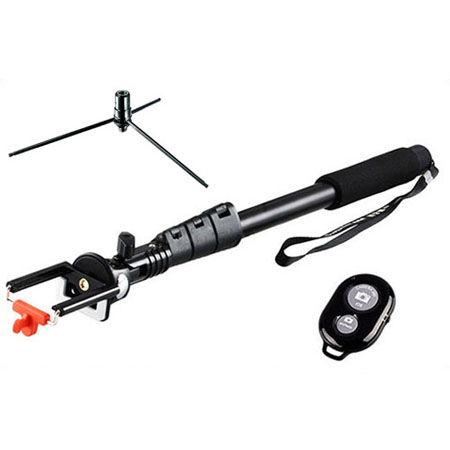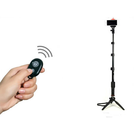 به همراه این مونوپاد و سه پایه یک وسیله به نام ریموت شاتر بلوتوث قرار دارد که با استفاده از آن می توانید از راه دور دوربین تلفن خود را کنترل کرده و عکاسی کنید. کافی است Bluetooth گوشی خود را روشن کرده و بعد از برقراری اتصال، شروع به عکاسی کنید.