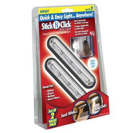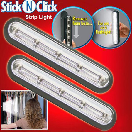 لامپ جادویی Stick N Click توسط 5 چراغ ال ای دی در داخل آن و کارکرد با باطری قلمی، هر جایی دور از دسترس برق را روشن نموده و با چسب مخصوص که در داخل پکیج قرار دارد بر روی دیوار، سقف یا ... ثابت می ماند. این لامپ جادویی فقط با لمس دست روشن و خاموش می شود. کارایی بالا و استفاده راحت لامپ جادویی Stick N Click باعث شده است تا بیشترین طرفداران را در بین چراغ های بدون نیاز به برق به خود اختصاص دهد. همچنین از این محصول می توانید به عنوان یک لامپ سیار پر نور استفاده کنید. قابل ذکر است در هر پکیج از این محصول 2 عدد لامپ قرار دارد.